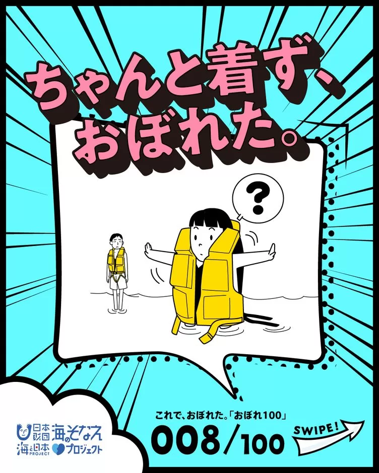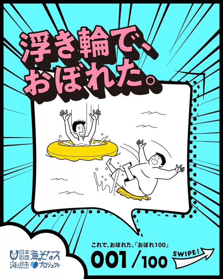 また、海のそなえプロジェクトでは今年、「おぼれ100」というコンテンツも作成。「おぼれ」のきっかけを100通り集め、イラストで原因・経緯・対策を伝えています。