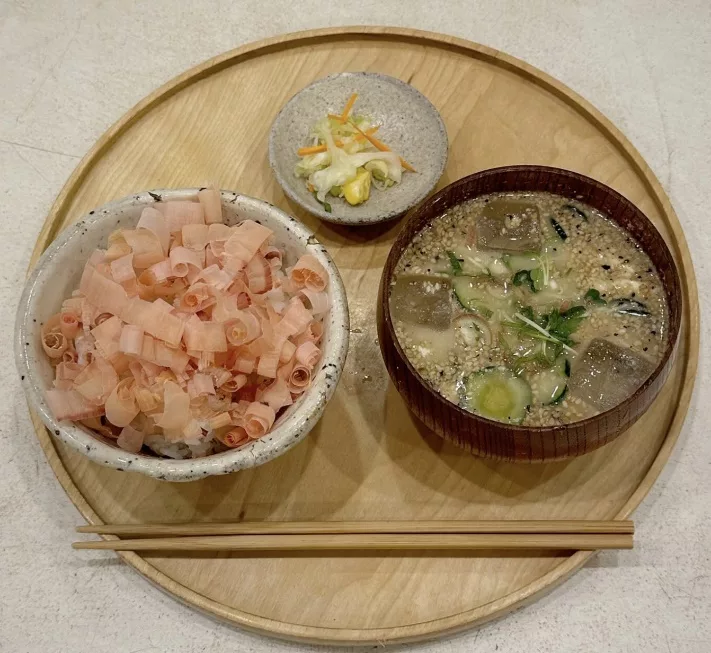 「メインは鰹節になります。その場で手で削った鰹節が乗ったご飯、一番出汁のお味噌汁、あとはちょっとしたおかずというシンプルな形です。鰹節はおひとり様ずつ削っております。鰹節のイチバンの楽しみ方は削りたて。これに勝るものはないなと思って、シンプルにしています」